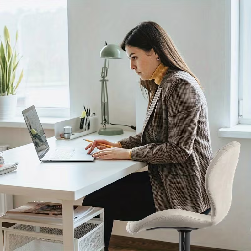 The high-density filling creates a soft and pleasant feel during long periods of sitting. The curved backrest supports the body in a natural position. The height adjustment helps set the ideal seating level for different surfaces. The 360° rotation makes movement smooth and effortless within the space. The metal base keeps the chair balanced on various flooring types.